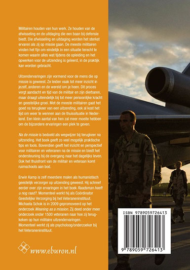 ‘Na de missie’ is bedoeld als wegwijzer bij terugkeer na uitzending. Het boek geeft zo veel mogelijk praktische tips en tools. Bovendien geeft het inzicht en perspectief voor militairen en veteranen na de missie en biedt het ondersteuning bij de overgang naar het dagelijks leven. Ook het thuisfront van de militair en veteraan komt ruimschoots aan bod.